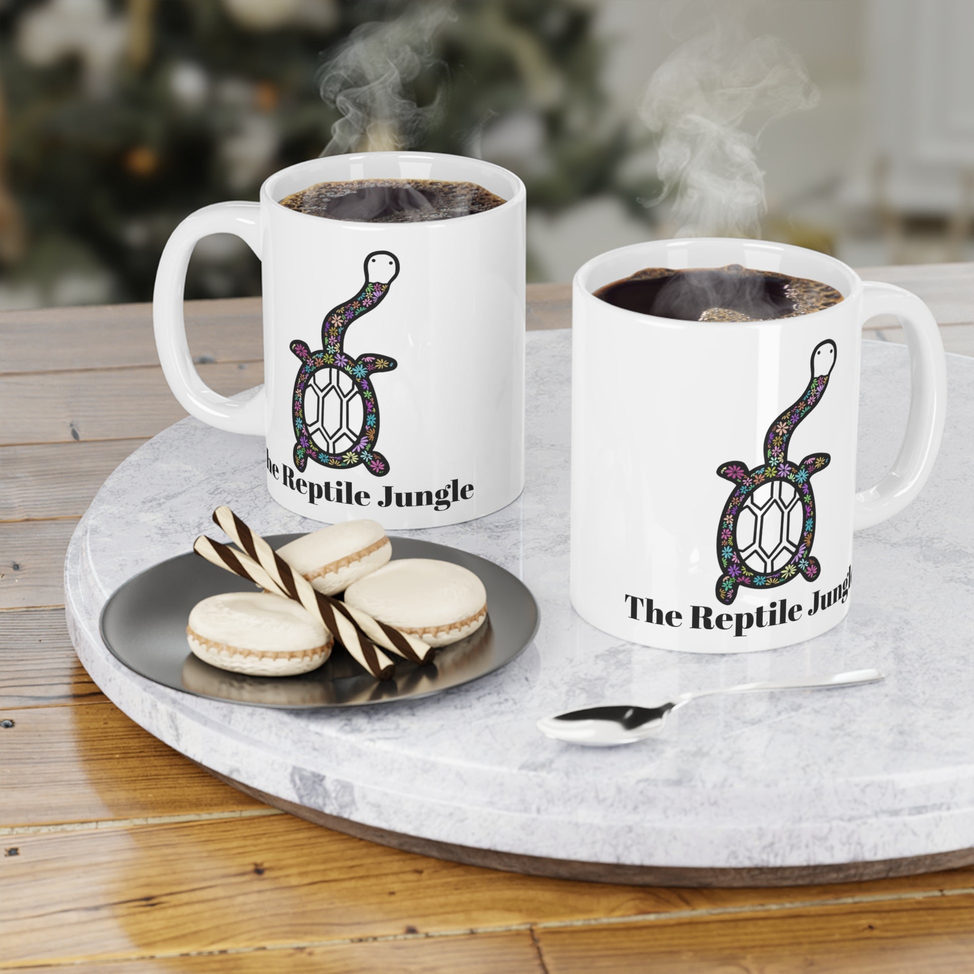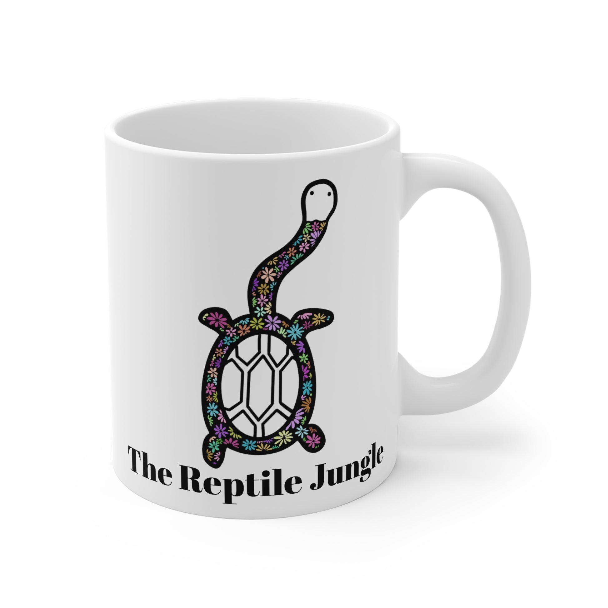 A hand designed mug by Sasha to represent a floral siebenrockii snake neck turtle.